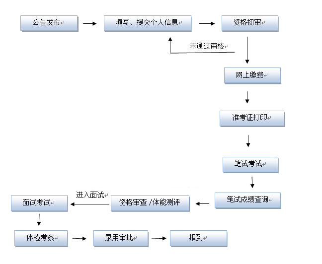 查看公告和報考指南→篩選報考職位→網(wǎng)上報名→資格初審→網(wǎng)上繳費→打印準考證→筆試→資格審查/體能測試→面試→體檢→政審→錄用