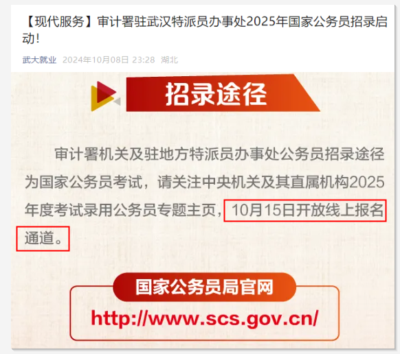 重要通知!2025年國(guó)考報(bào)名時(shí)間定啦!昨晚,武大就業(yè)發(fā)布《審計(jì)署駐武漢特派員辦事處2025年國(guó)家公務(wù)員招錄啟動(dòng)!》,其中提到:2025國(guó)考將于10月15日開放報(bào)名通道。